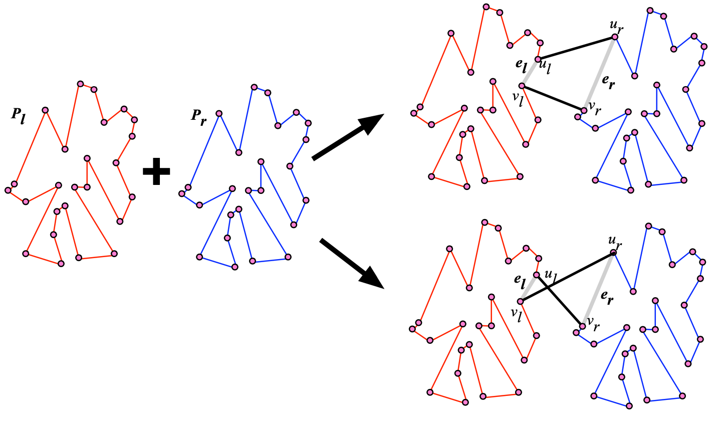To do this, we try all possible pairs of edges across both sides and pick the pair which when connected gives the minimum cost. This yields the following algorithm.