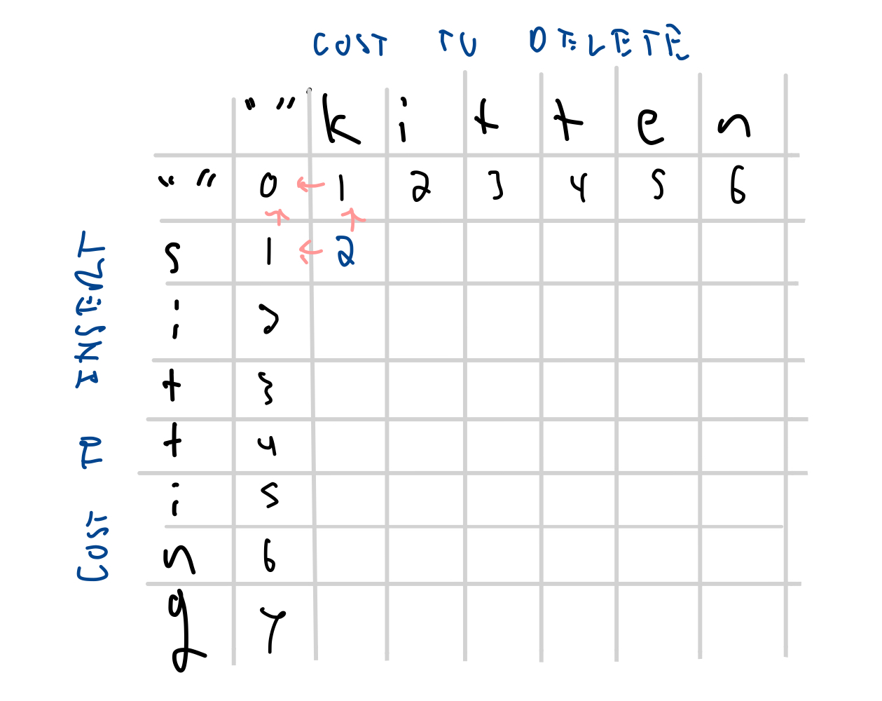 We fill in the values in the first row to give the cost of deleting characters from 'kitten' to match the empty string '' to the left.