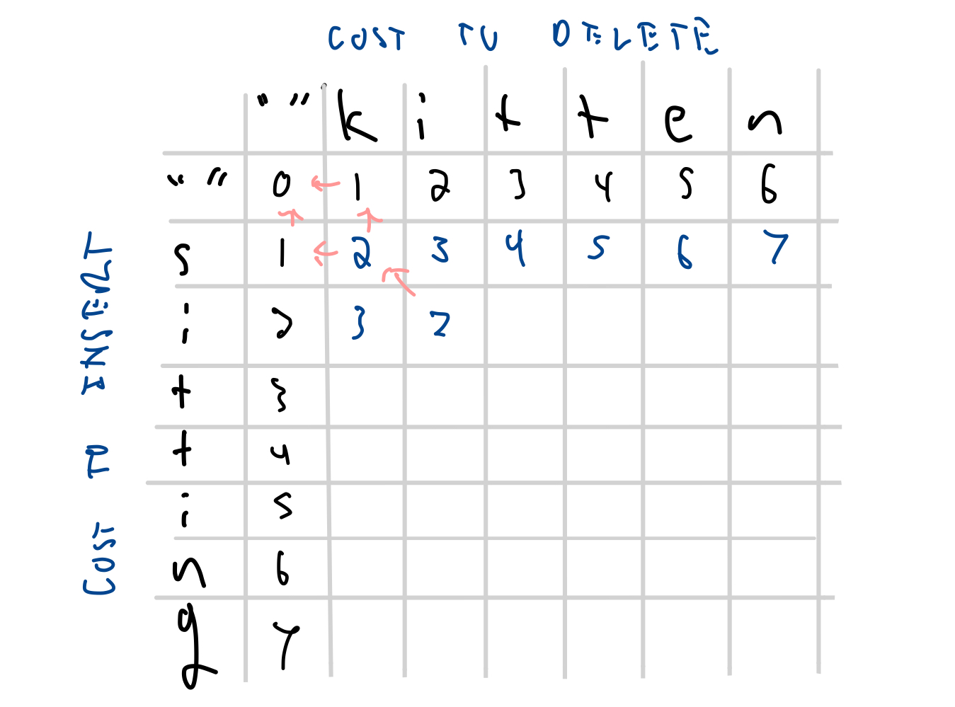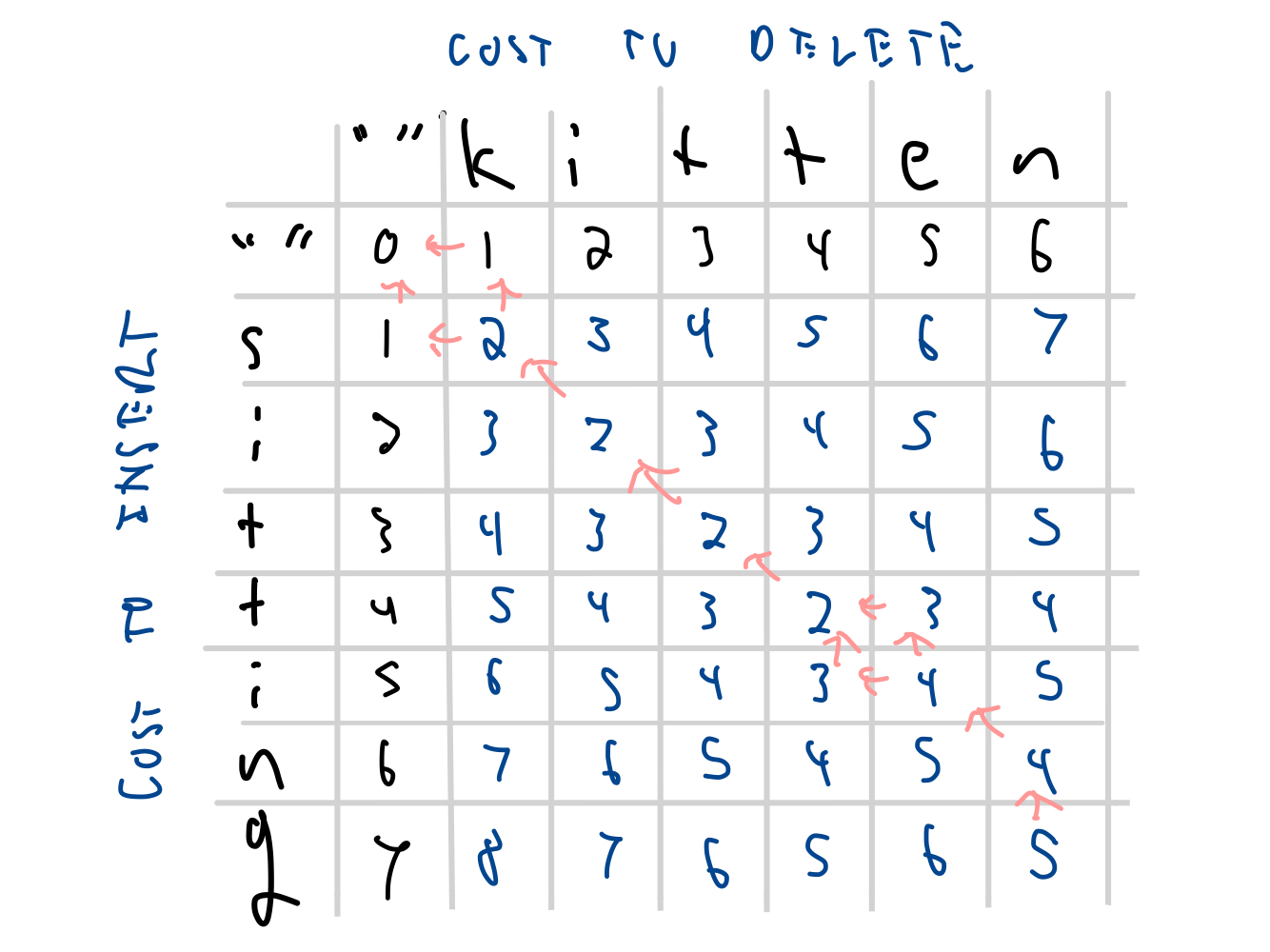 $$ \mathit{MED}(S, T) = \begin{cases} \mathit{MED}(S[1:], T[1:]), ~~~~~~~~~~~~~~~~~~~~~~~~~~~~~~~~~~~~~~~~~~~~\texttt{if}~~S[0]=T[0] \\ 1+\min\{\mathit{MED}(S[1:], T),\mathit{MED}(S, T[1:])\}, ~~~~~\texttt{otherwise} \\ \end{cases} $$| Cost to Delete | ||||||||
