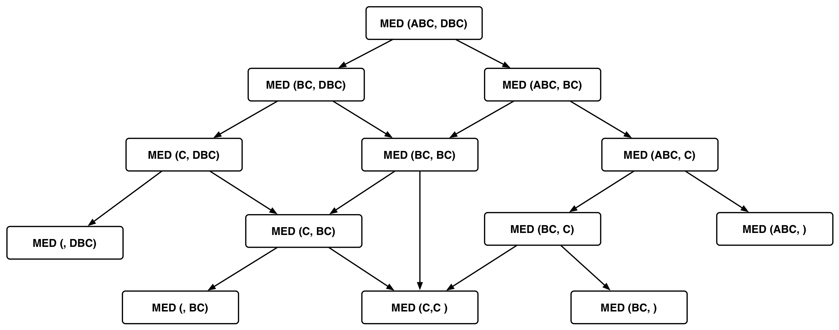 $$ \mathit{MED}(S, T) = \begin{cases} \mathit{MED}(S[1:], T[1:]), ~~~~~~~~~~~~~~~~~~~~~~~~~~~~~~~~~~~~~~~~~~~~\texttt{if}~~S[0]=T[0] \\ 1+\min\{\mathit{MED}(S[1:], T),\mathit{MED}(S, T[1:])\}, ~~~~~\texttt{otherwise} \\ \end{cases} $$Just as with Knapsack, this recursion tree for this recurrence yields an exponential number of nodes. How many nodes are there, and what is the depth?
