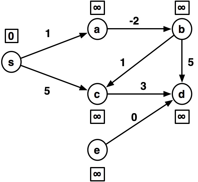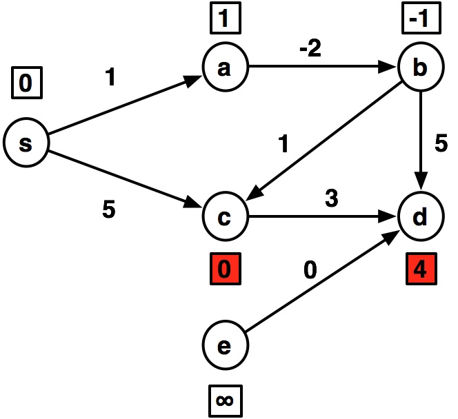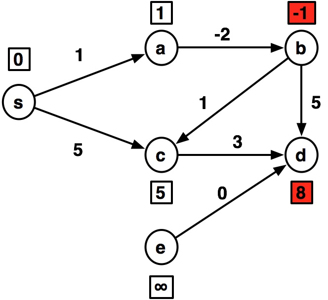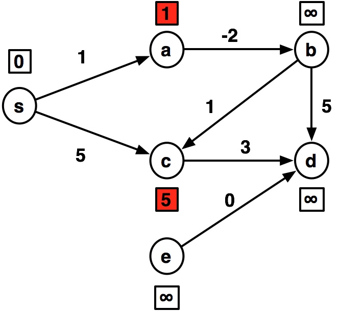 ---- s:0 a:1 b:inf c:5 d:inf e:inf ---- s:0 a:1 b:-1 c:5 d:8 e:inf ---- s:0 a:1 b:-1 c:0 d:4 e:inf ---- s:0 a:-1 b:-1 c:0 d:3 e:inf ---- s:0 a:-1 b:-3 c:0 d:3 e:inf ---- s:0 a:-1 b:-3 c:-2 d:2 e:inf